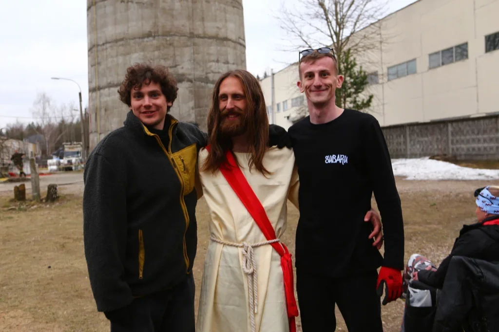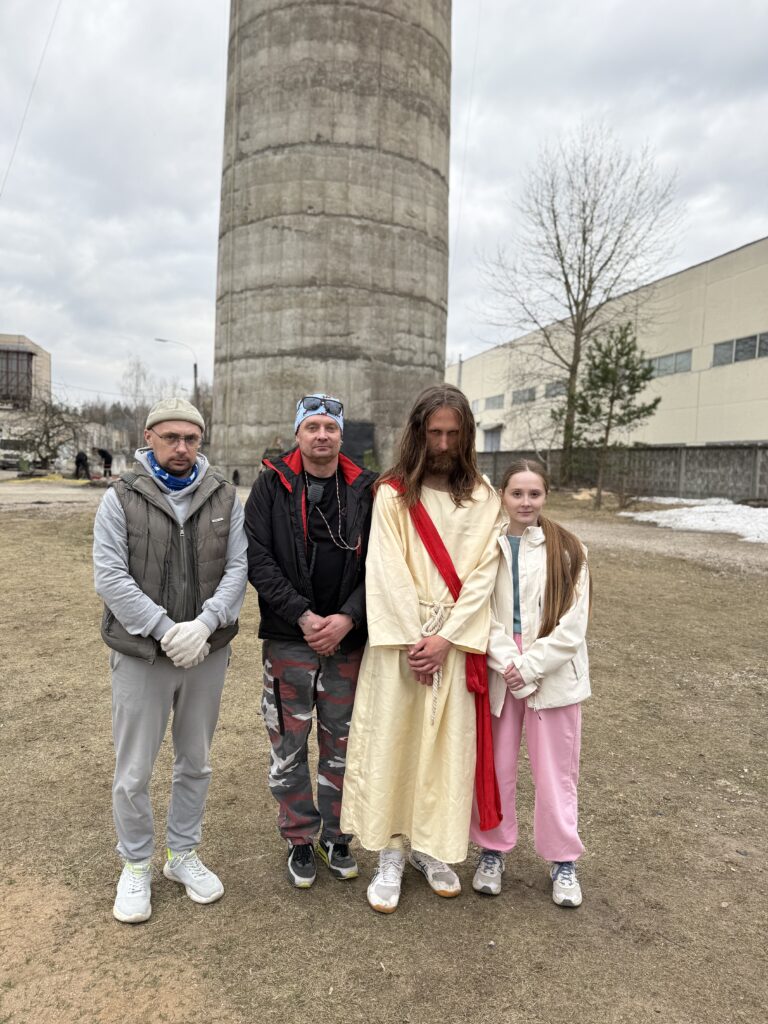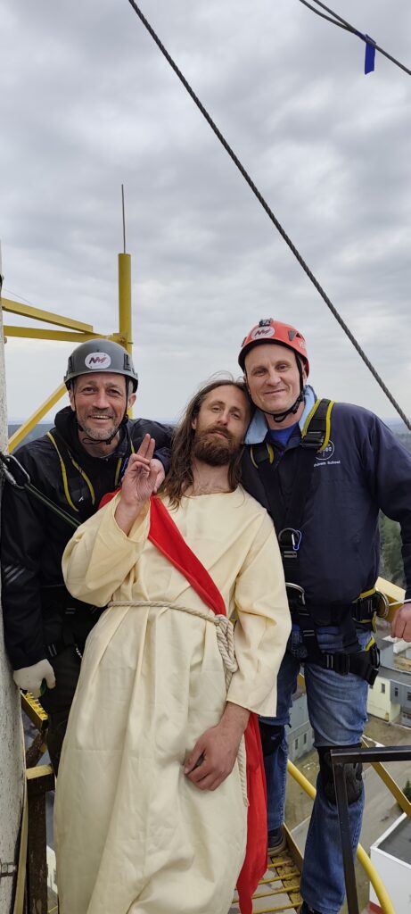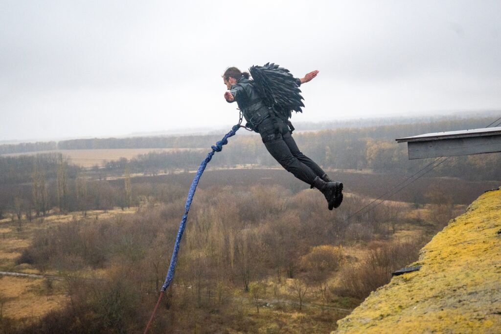 Задумчивый длинноволосый парень с бородой молча выходит на край экзита самого высокого объекта для прыжков с верёвкой в Беларуси. Альпинистскую обвязку прячет длинное тканое одеяние, поверх которого наброшена красная накидка-гиматий.